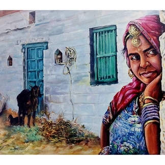 Name Of The Artwork: Acrylic on canvas Caption Of Artwork: Sunlighting woman Name Of The Artwork: Acrylic on canvas Caption Of Artwork: Rajasthani women village life