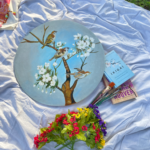 Name Of The Artwork: Serenade of Sparrows Caption Of Artwork: Whispers of Tranquility: Three Sparrows in a Symphony of Blue and Grey, adorned by Delicate White Blossoms. Name Of The Artwork: Skyward voyage Caption Of Artwork: Elevation Elegance: Birds Dance Amidst Mountains and Sea.